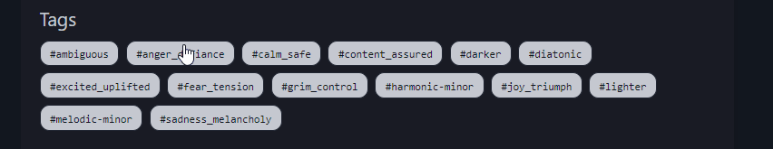 Affect-based tags for Chord Relationships (relative notation for moves between chords) were added to Chordex. These tags are required to navigate the 192 relationships efficiently and make the system usable out of the box.