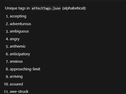 The objective was to avoid my own subjective bias and instead source affect tags from global consensus. The internet corpus served as the source of truth.